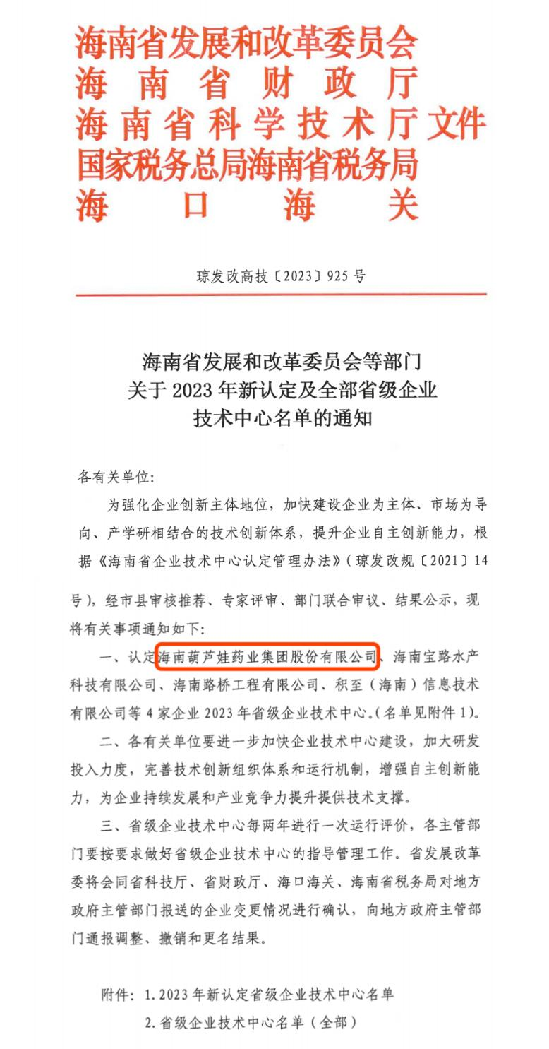 近日,海南省发改委等多部门联合公布了《关于2023年新认定及全部省级企业技术中心名单的通知》,其中,海南w66旗舰厅药业集团股份有限公司成功通过评审,被认定为省级企业技术中心,是本次获批的4家企业之一。